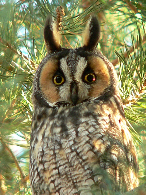 One of nine Long-eared Owls that had been roosting in pine trees at a house on Nightingale Road south of Moxee, Yakima County, WA. Feb. 12, 2006.