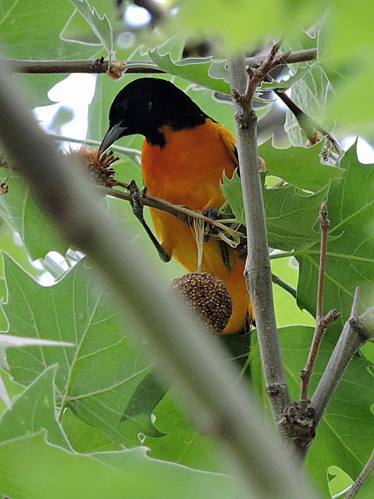 Baltimore Oriole picking at a seed pod in a sycamore tree in East Potomac Park in Washington, DC. May 14, 2018.