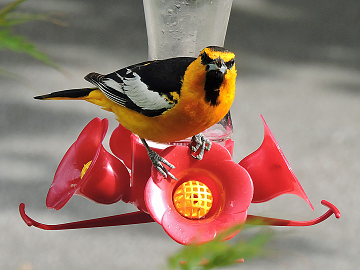 Another shot of the Bullock's Oriole on the hummingbird feeder near the kitchen window at our house southwest of the Yakima, WA airport. June 25, 2018.