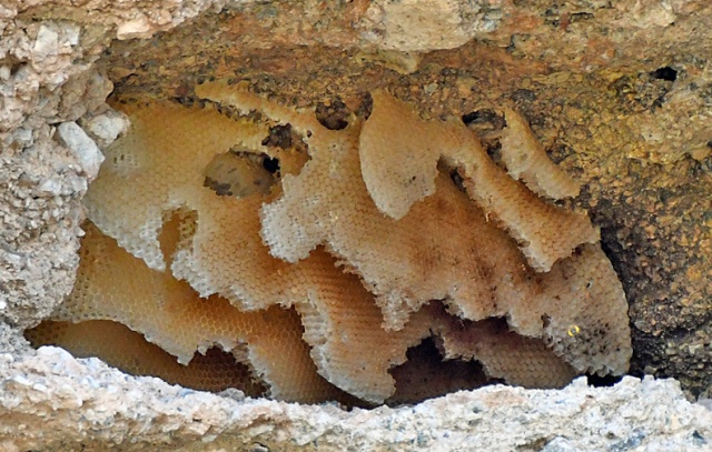 Wild bee hive in a hole in a cliff near the Cactus Forest South Trail in Saguaro National Park East, Tucson, Arizona. February 24, 2024.
