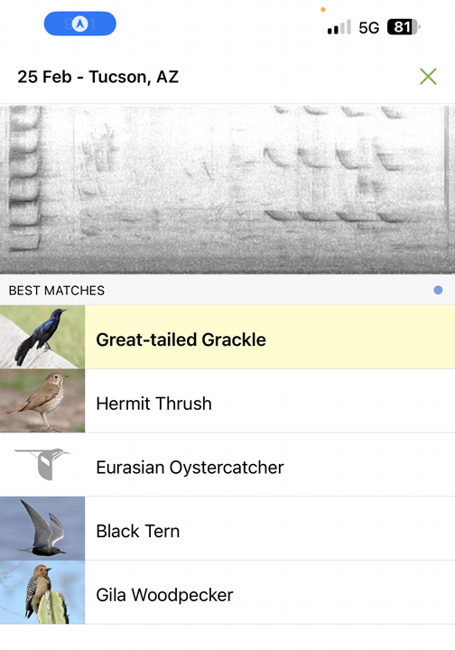 This is a list generated by the Merlin app on my iPhone at Christopher Columbus Park in Tucson, Arizona, on February 25, 2024. Eurasian Oystercatcher is a basically impossible there. The nearest one to Tucson is over 5000 miles away, though there have been two sightings in New Foundland. Black Terns have been seen in the Tucson area but never in winter. Merlin is good but it does make mistakes.