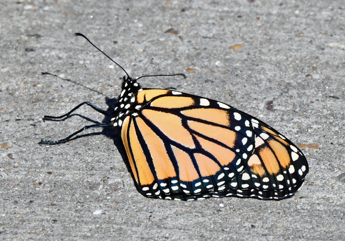 Monarch butterfly (Danaus plexippus) on the fishing pier in Indian Point Park in Portland, Texas. It was flying in a stiff wind, then landed on the pier. It laid there for several minutes, then took off again and seemed to be in good condition. January 14, 2026.