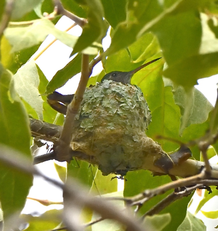 Female Berylline Hummingbird on its nest at the Ramsey Canyon Preserve south of Sierra Vista, Cochise County, Arizona. August 14, 2025.