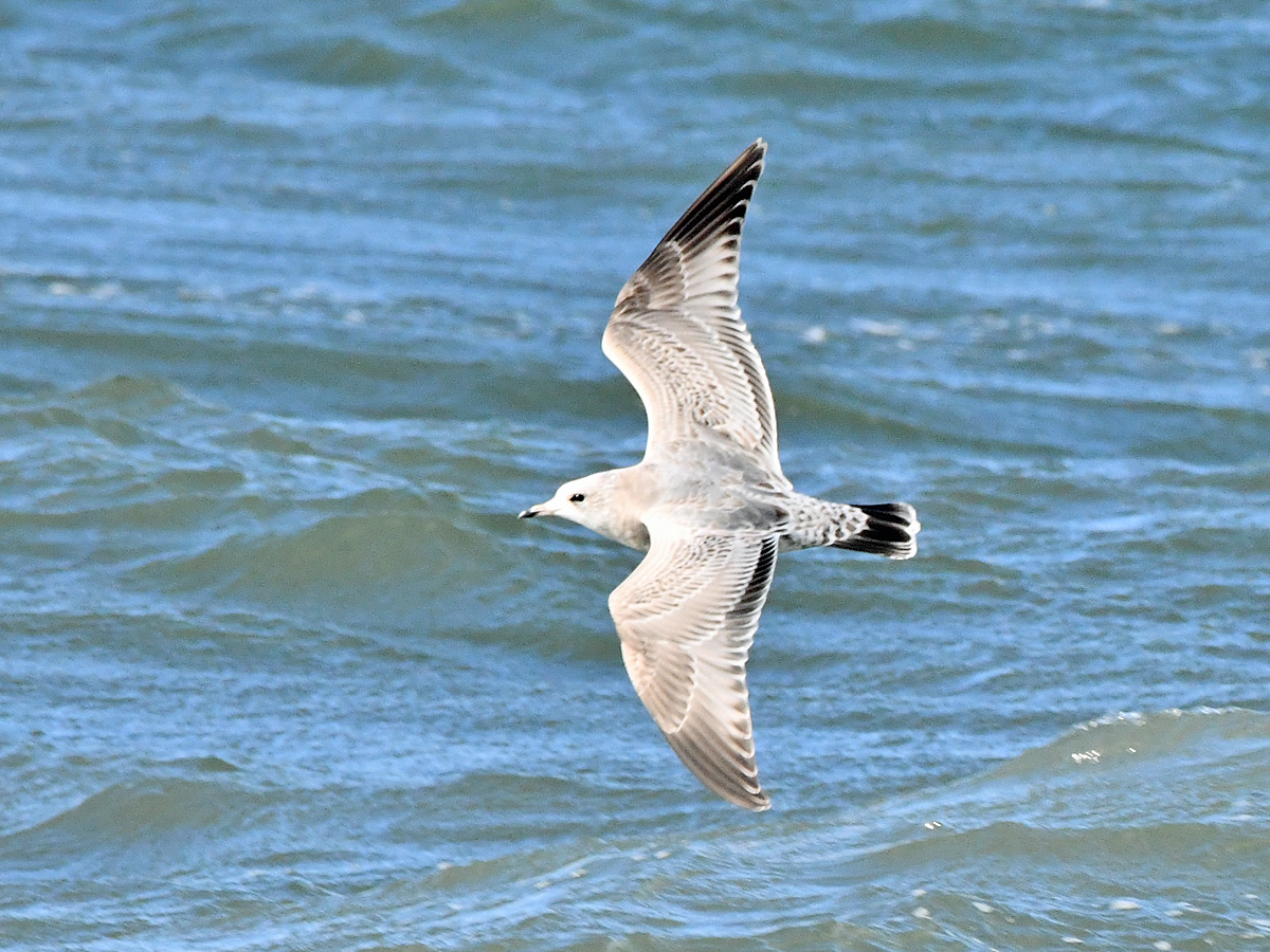 First cycle Short-billed Gull flying past the lighthouse on West Point in Discovery Park, Seattle, Washington. October 19, 2025.