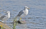 | American Herring Gull (the large one) with a juvenile Ring-billed Gull at the boat launch near the north end of the Vernita Bridge along the Columbia River in Grant County, Washington. September 19, 2025. Viewed: 294 times.