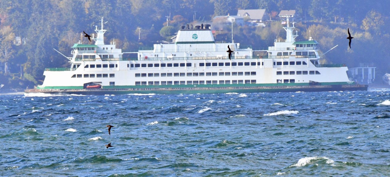 Short-tailed Shearwaters flying south over Puget Sound west of Discovery Park, Seattle, Washington, with a Washington State Ferry in the background. October 19, 2025.
