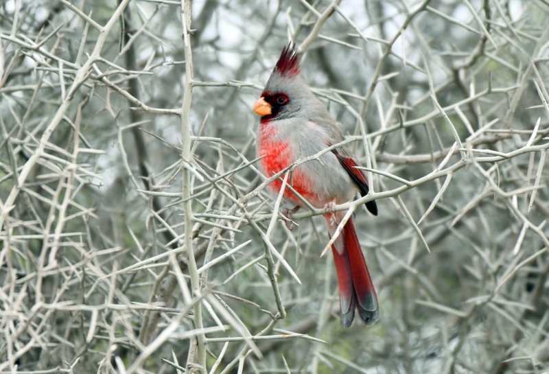 Pyrrhuloxia in a crown of thorns bush along Jara Chinas Road in Hidalgo County, Texas. January 11, 2026.