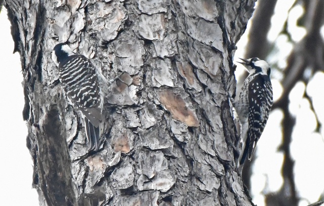 Red-cockaded Woodpeckers high in a long-leaf pine tree in the W. G. Jones State Forest southwest of Conroe, Texas. March 4, 2026.