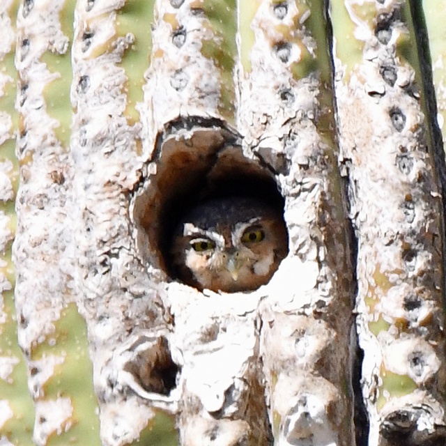 Elf Owl in a woodpecker cavity in a saguaro in Ventana Canyou, Tucson, Arizona. March 26, 2026.