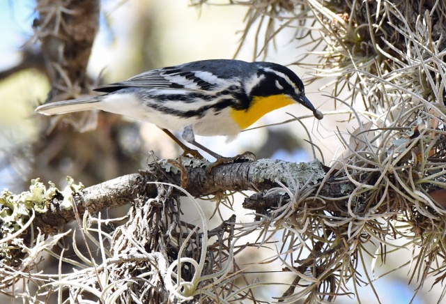 Yellow-throated Warbler in Joshua Springs Park in Kendall County, Texas. March 30, 2026. It has a tasty morsel, possibly a daddy longlegs spider, that it picked from the ball moss in the tree. March 30, 2026.