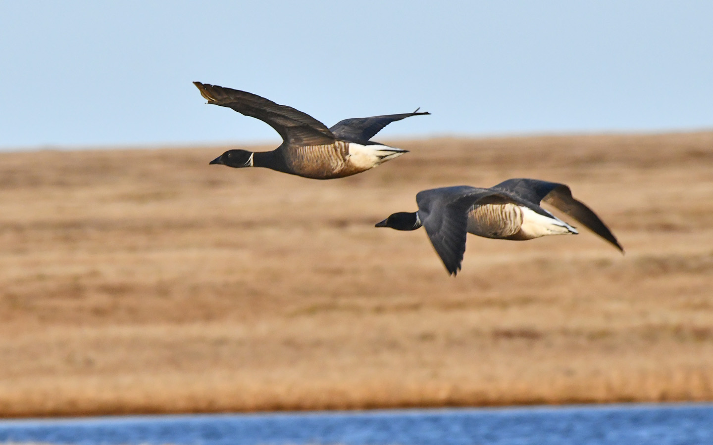 A pair of Brant flying over a small lake near Utqiagvik, Alaska, at 11:45 p. m. We birded until midlnight in full sun the three days we were in Utqiagvik. June 17, 2025.