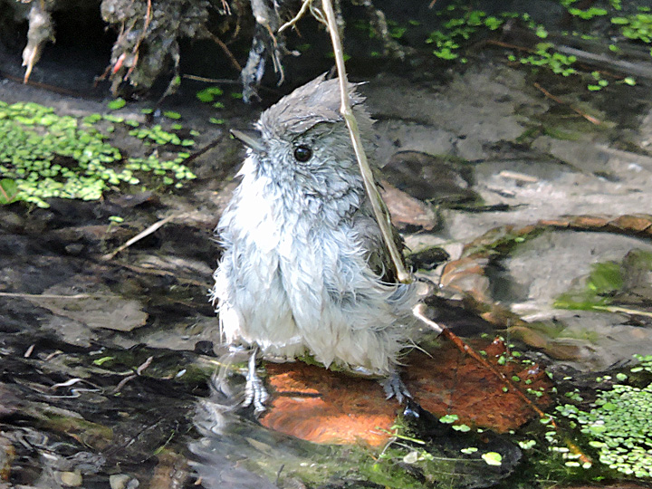 Oak Titmouse taking a bath in Laguna Grande Park, Monterey, CA. Sept. 14, 2018.