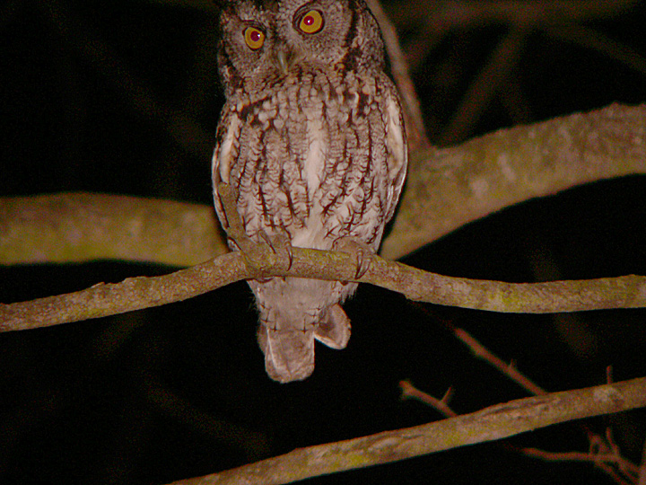 Eastern Screech-Owl in Benstsen-Rio Grande Valley State Park. Aiming a camera in the dark is more difficult than you might think. Feb. 7, 2008.