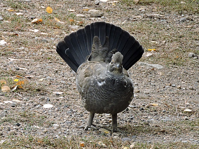 Male Dusky Grouse displaying at the Hellroaring Creek Trailhead in Yellowstone National Park. September 26, 2020.