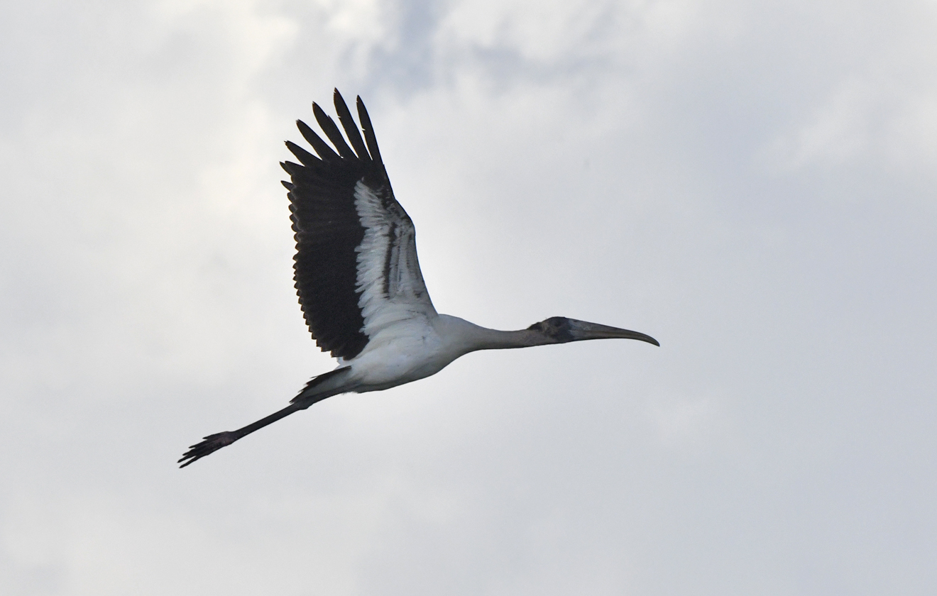 Wood Stork flying over the Orphanage Road Pond in Cameron County, Texas. December 13, 2025.